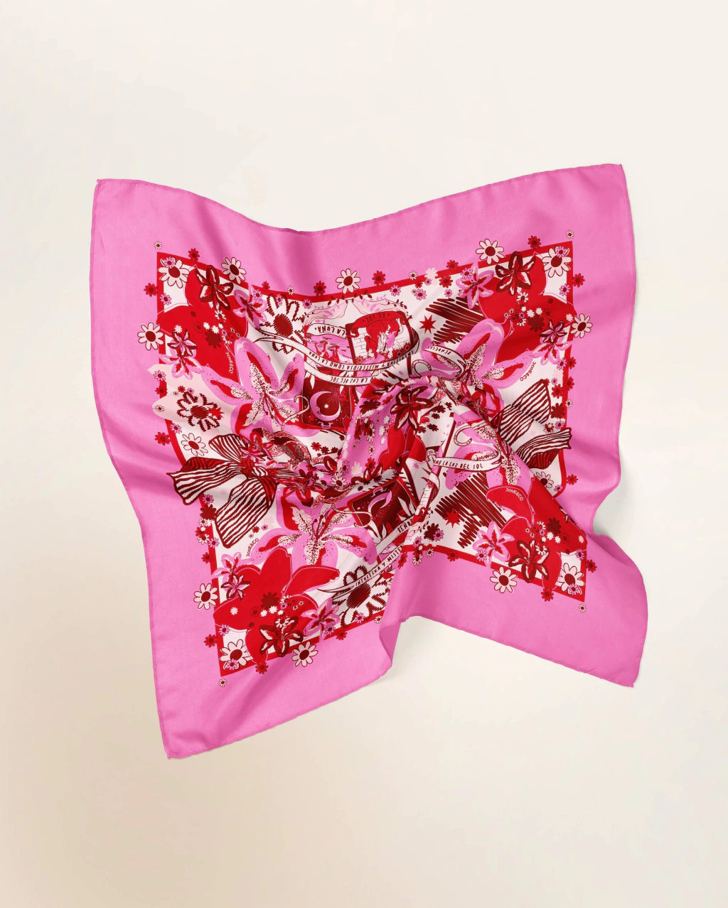 Pañuelo cuadrado JOIEO de acabado satén y estampado multicolor, donde predominan el color rojo, bordo, fucsia y rosa. El diseño está dibujado a mano e inspirado en un campo floral tipo liberty con connotaciones surreales.
